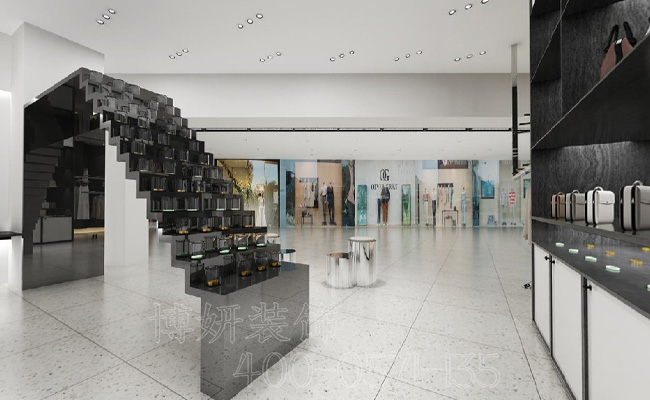 奢侈品店铺内采用阶梯式的展台设计,别致大气,抓人眼球.黑色的展台座位背景,更加更够突出上面摆放的时尚单品。